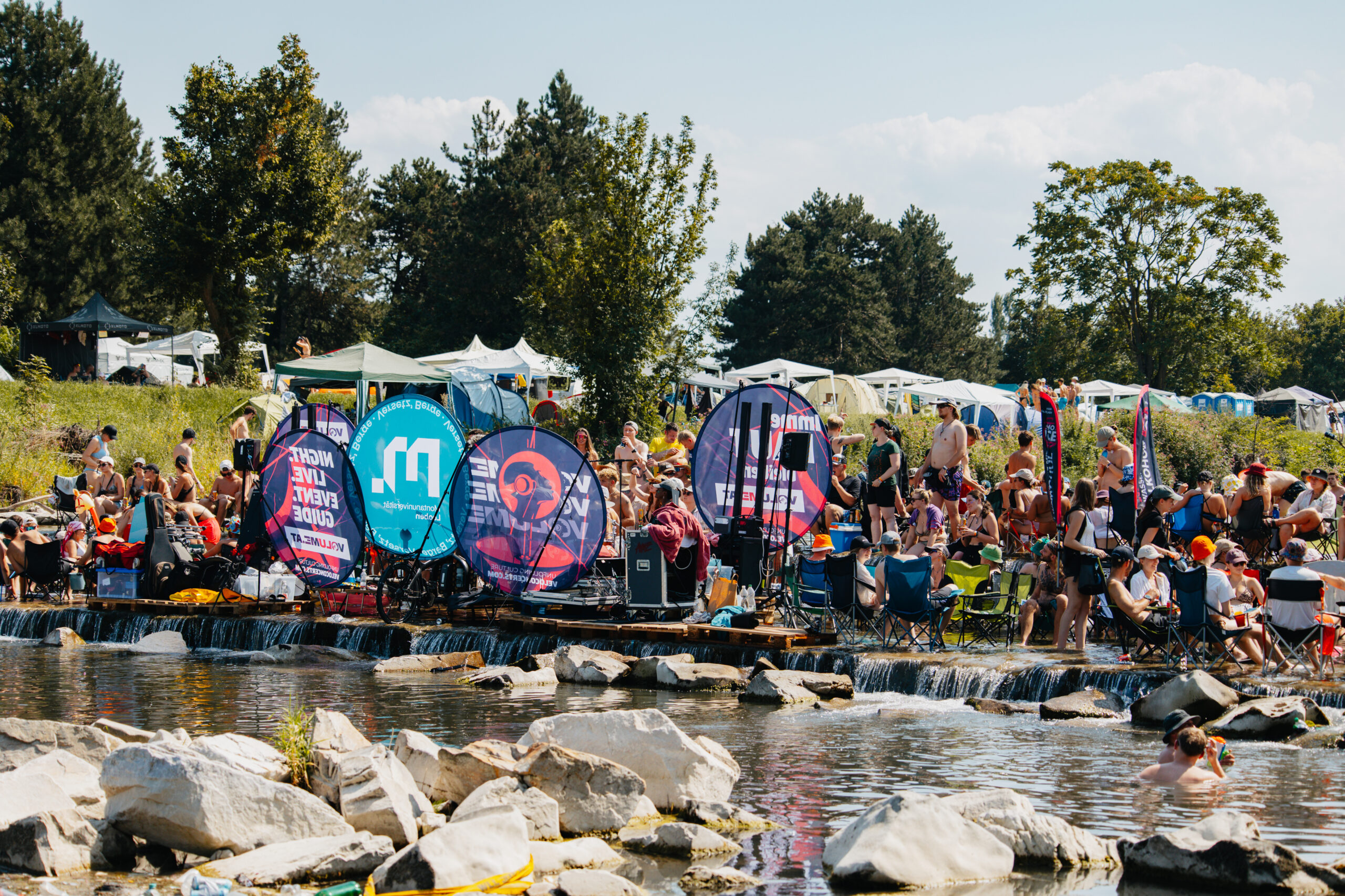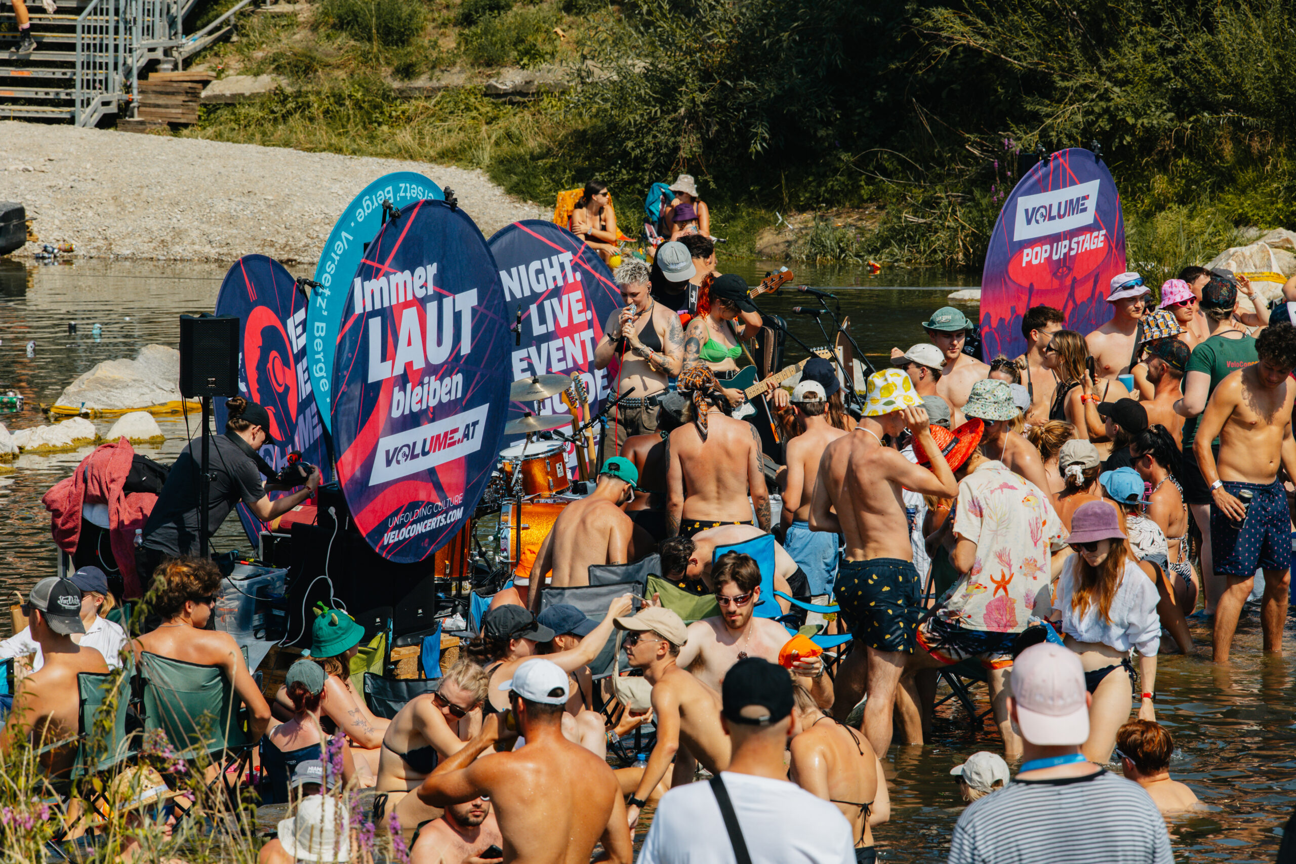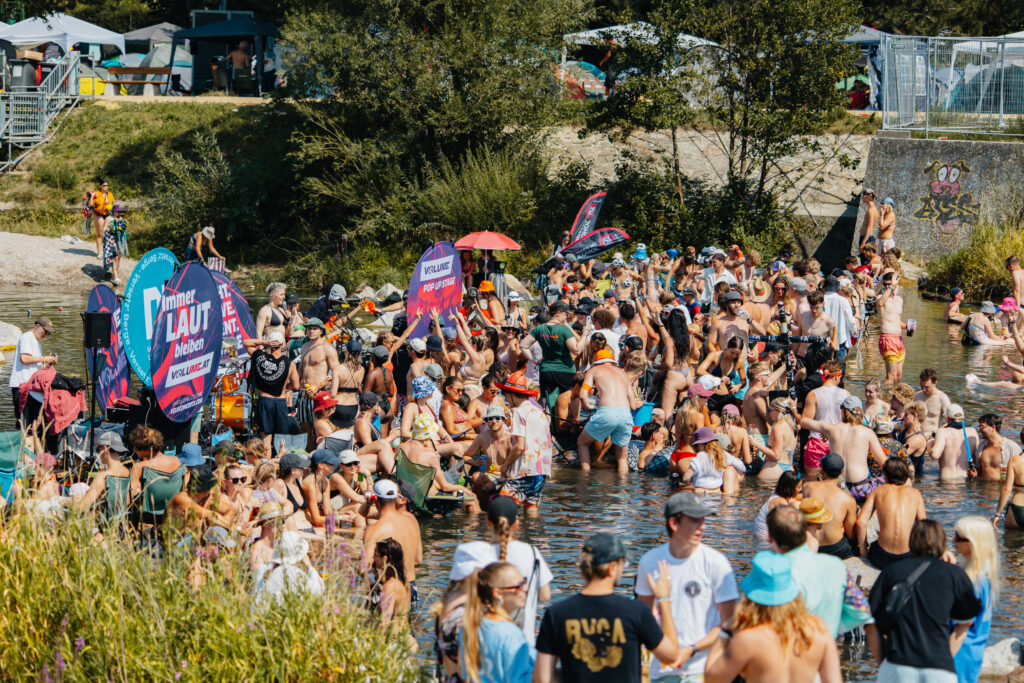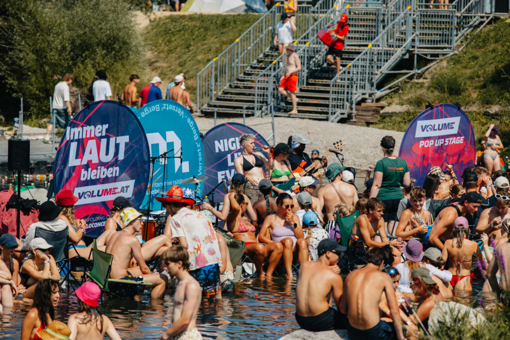 Eine Aktivierung, die wir besonders feiern, ist unsere VOLUME Pop Up WaterStage am Frequency Festival. Dank jahrzehntelanger Eventerfahrung und einer bedingungslosen Partnerschaft mit VeloConcerts haben wir gemacht, was sonst keiner macht: eine mobile Bühne mitten in der Traisen – im Einklang mit der Umgebung, perfekt auf das Gelände abgestimmt und einzigartig in ihrer Umsetzung.